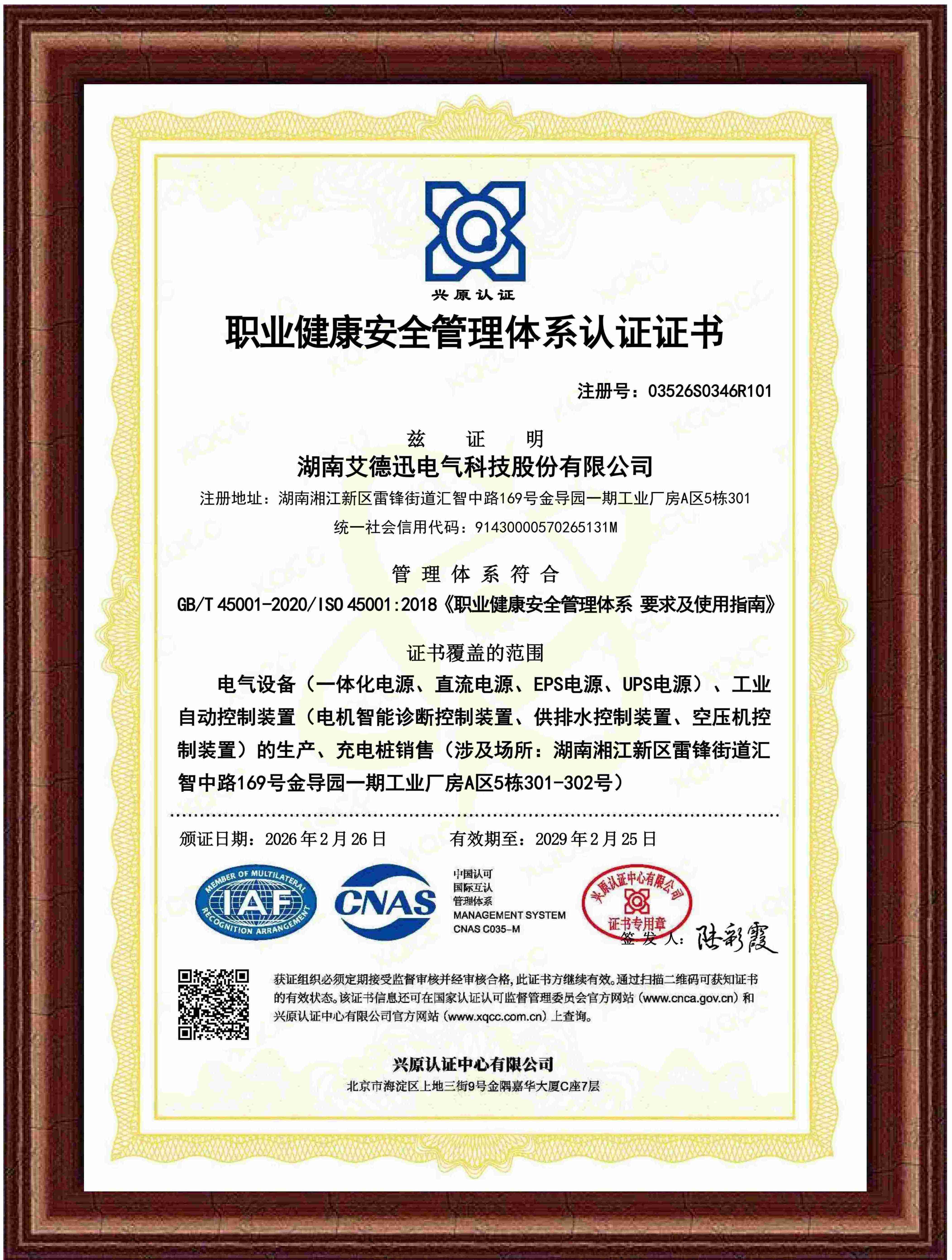 职业健康安全管理体系认证证书